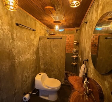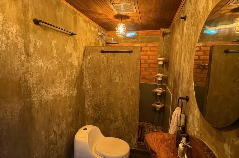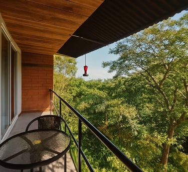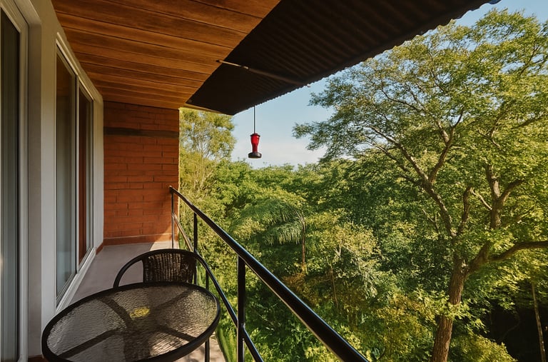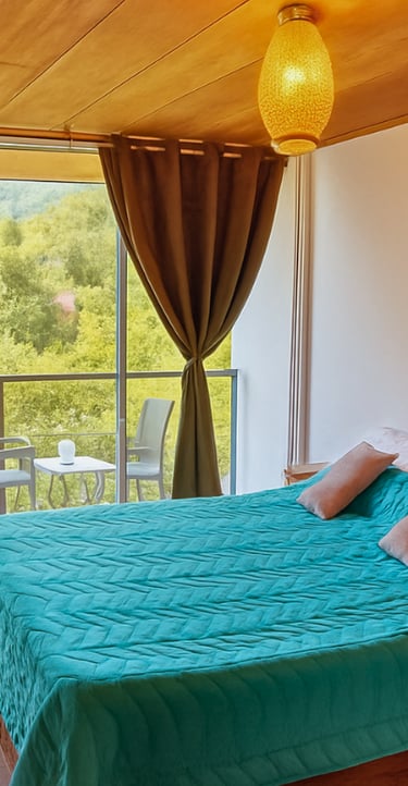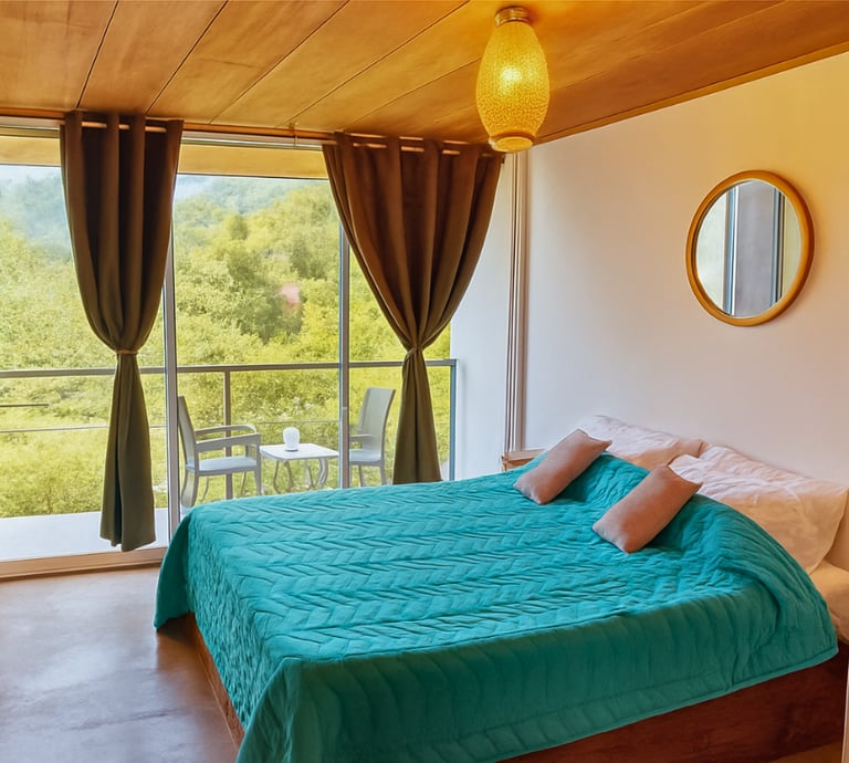 Our 18 m² double room features a cozy, comfortable setting with a private bathroom and a private balcony overlooking beautiful natural scenery. Perfect for a peaceful and relaxing stay.